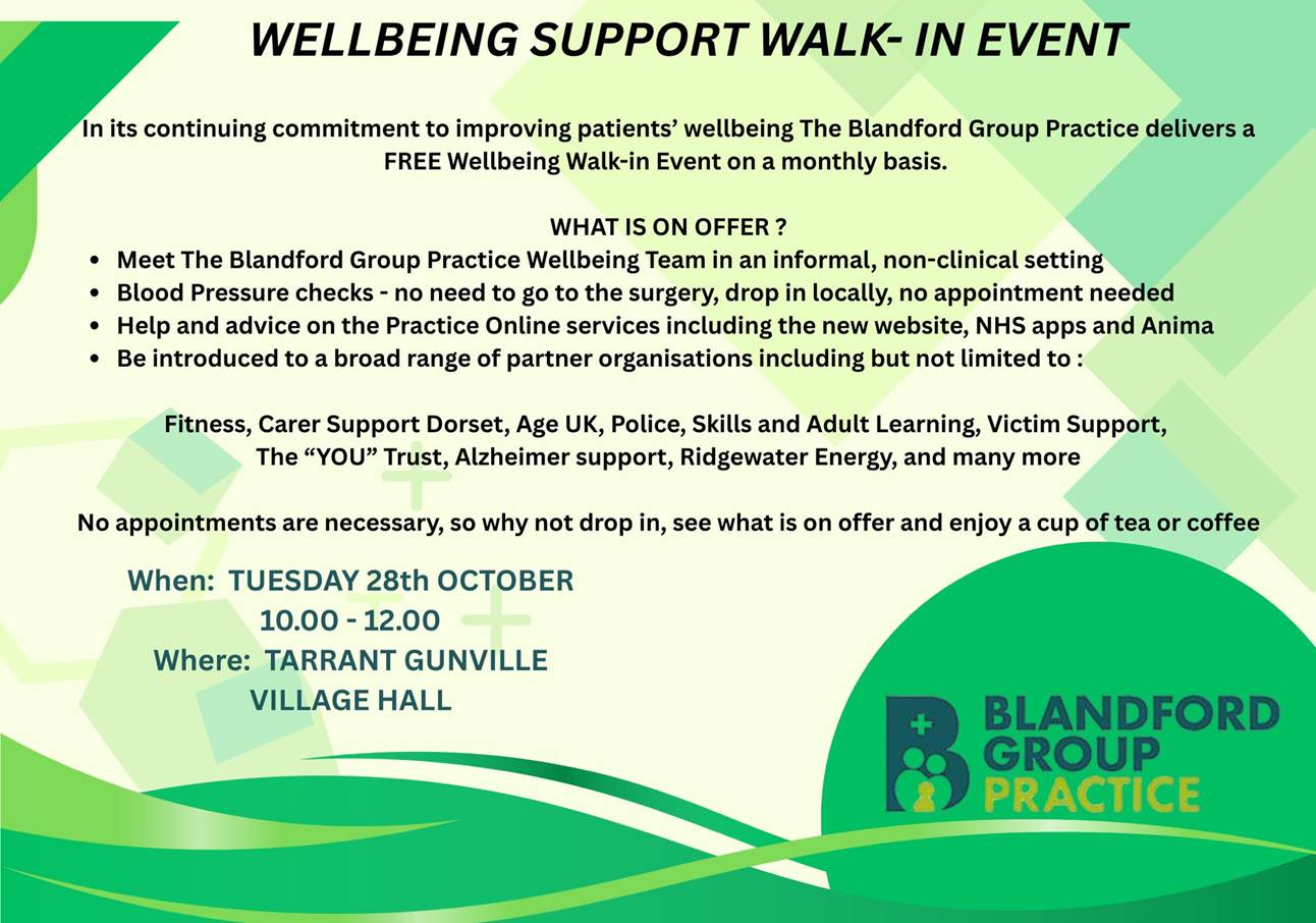 image003.jpg by Jane Mann|Published October 13, 2025-at dimensions 1292 × 906 in Blandford Group Practice – Wellbeing support walk in event – Tuesday 28th October 1000-1200 at Tarrant Gunville Village Hall – No appointment needed Images navigation